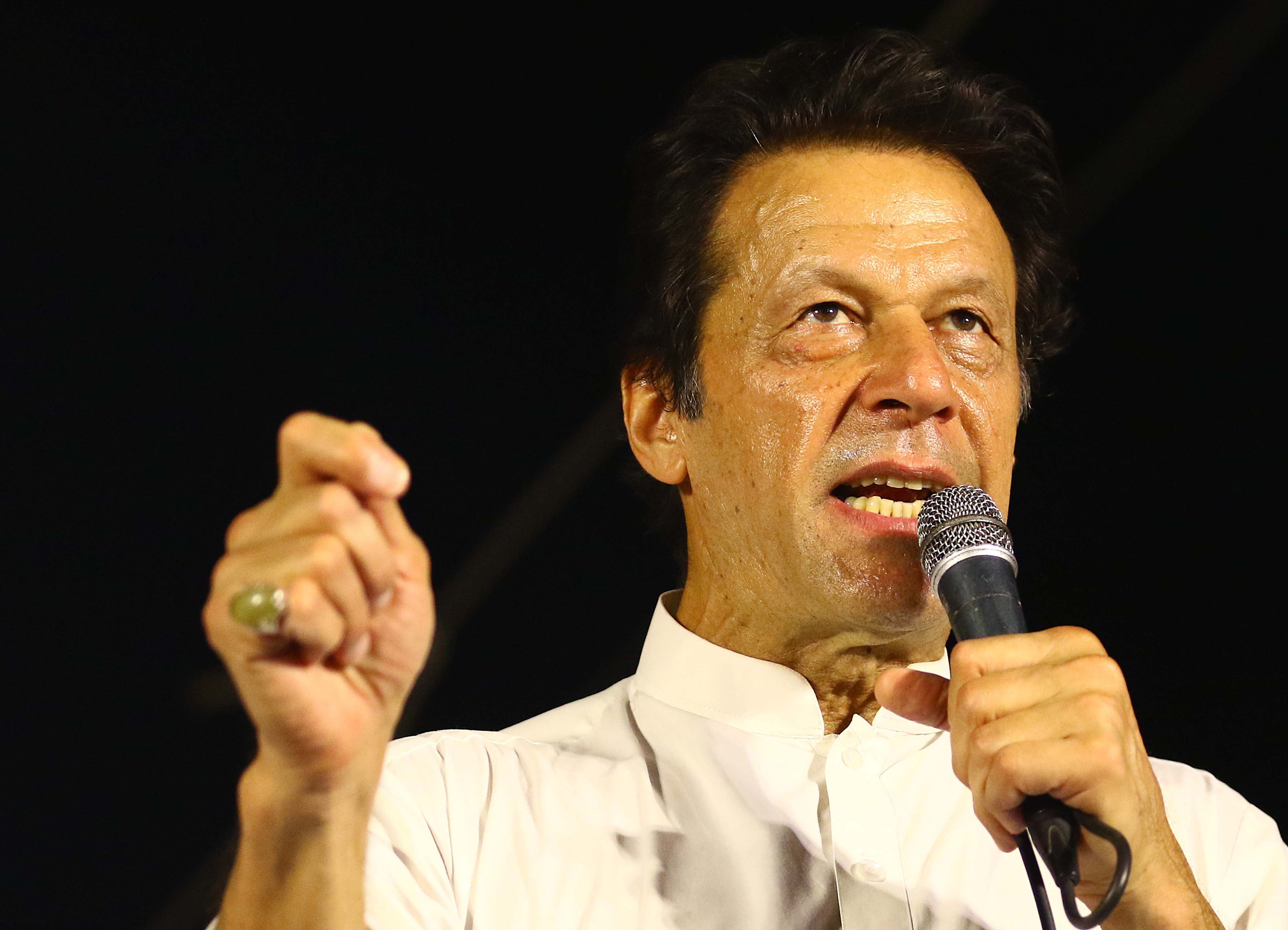 epa06862302 Imran Khan, (C) head of political party Pakistan Tehrik-e-Insaf, speaks to supporters as the country gears up for general elections, in Karachi, Pakistan, 03 July 2018. Pakistan is set to hold general and provincial elections on 25 July with around 105 million people registered to vote, according to the electoral commission. EPA-EFE/SHAHZAIB AKBER