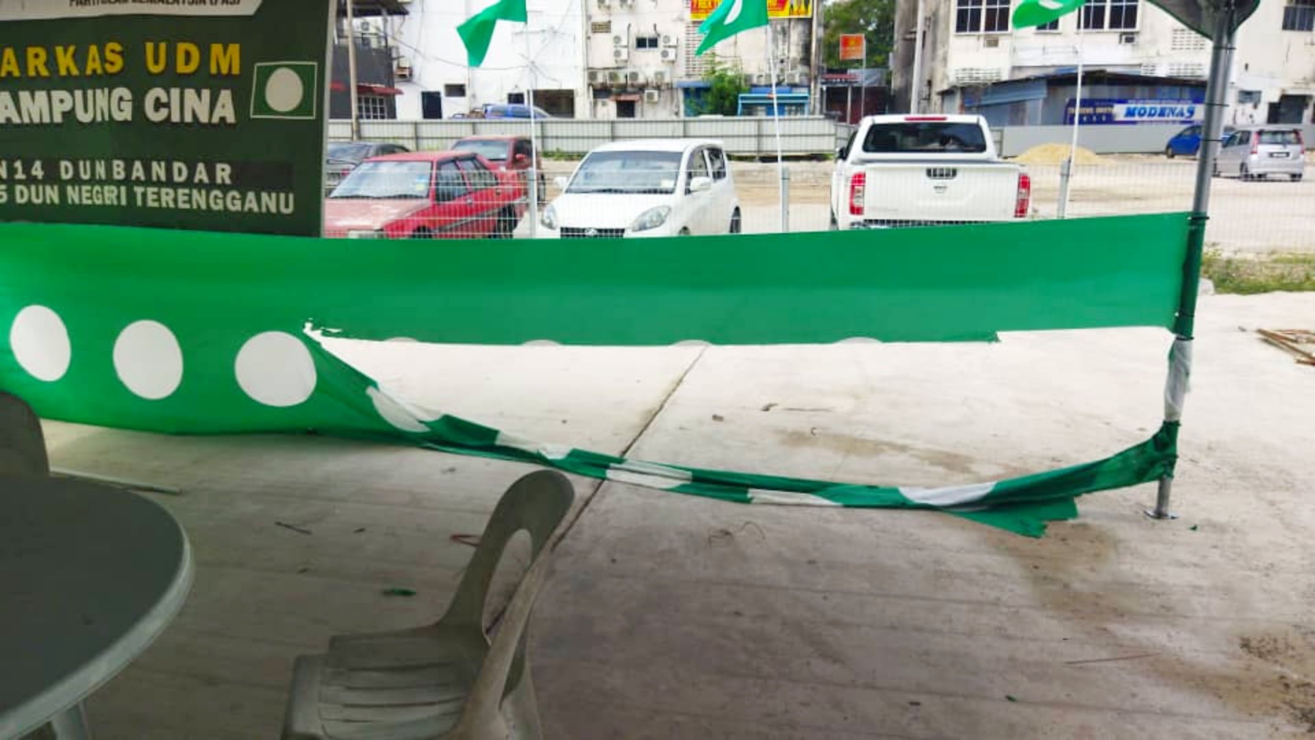 “semasa saya buat rondaan di perumahan Kampung Cina, saya dapati bendera PAS telah disembur cat warna hitam dan kemudian apabila saya kembali ke Markaz saya dapati bendera yang menutupi khemah telah rosak,” kata Alex dalam laporannya.