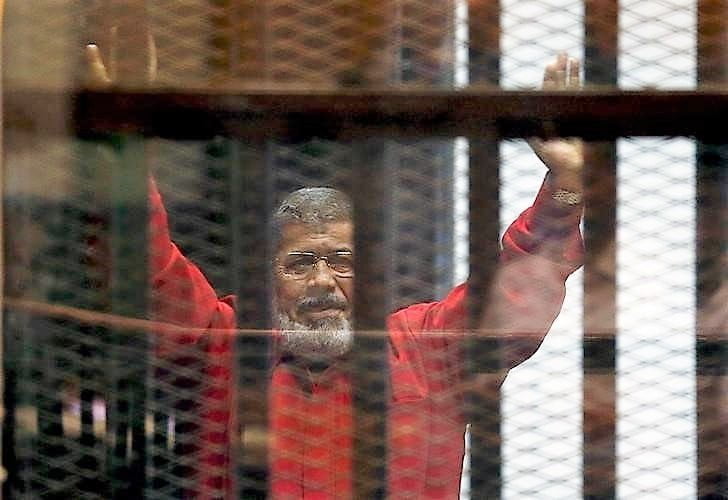Deposed President Mohamed Mursi greets his lawyers and people from behind bars at a court wearing the red uniform of a prisoner sentenced to death, during his court appearance with Muslim Brotherhood members on the outskirts of Cairo, Egypt, June 21, 2015. REUTERS/Amr Abdallah Dalsh/File Photo