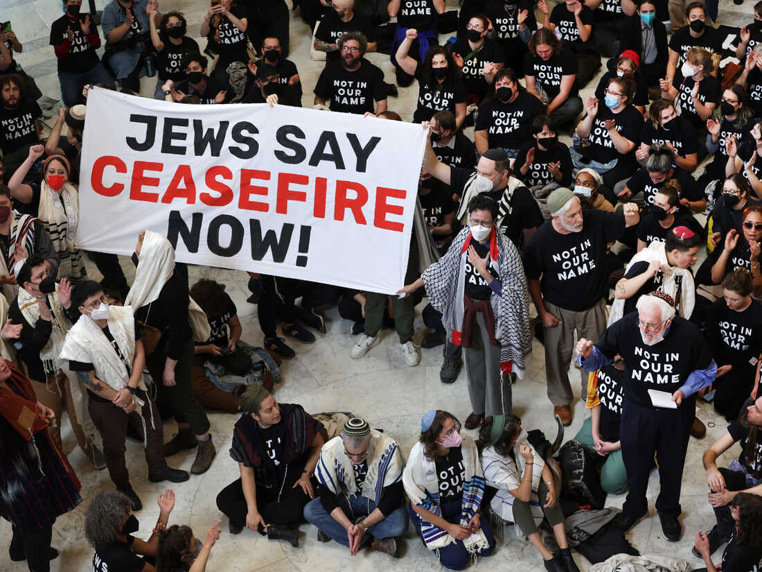 WASHINGTON, DC - OCTOBER 18: Protesters hold a demonstration in support of a cease fire in Gaza in the Cannon House Office Building on October 18, 2023 in Washington, DC. Members of the Jewish Voice for Peace and the IfNotNow movement staged a rally to call for a cease fire in the Israel–Hamas war. (Photo by Alex Wong/Getty Images)