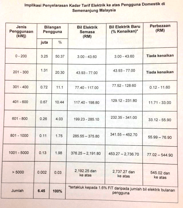 Selaras dengan penyelarasan kadar purata tarif elektrik daripada 33.54 sen/KWJ kepada 38.53 sen/KWJ, beliau berkata kerajaan akan menyelaraskan semula tarif elektrik yang melibatkan pengguna domestik, komersil dan industri. “Bagi pengguna domestik, purata tarif akan dinaikkan kepada 31.66 sen/KWJ daripada 28.63 sen/KWJ iaitu penyelarasan sebanyak 1.21 sen/KWJ (3.03 peratus).
