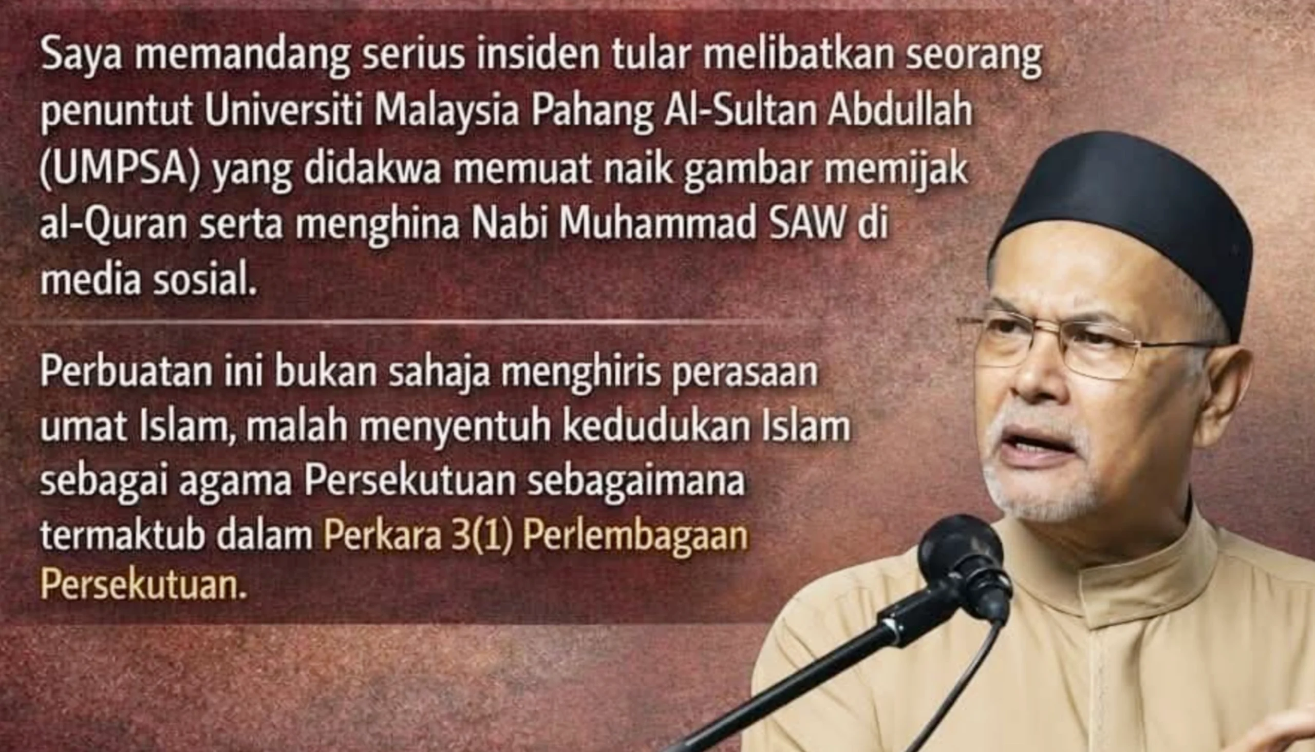 Saya memandang serius insiden tular melibatkan seorang penuntut Universiti Malaysia Pahang Al-Sultan Abdullah (UMPSA) yang didakwa memuat naik gambar memijak al-Quran serta menghina Nabi Muhammad SAW di media sosial. Perbuatan ini bukan sahaja menghiris perasaan umat Islam, malah menyentuh kedudukan Islam sebagai agama Persekutuan sebagaimana termaktub dalam Perkara 3(1) Perlembagaan Persekutuan.