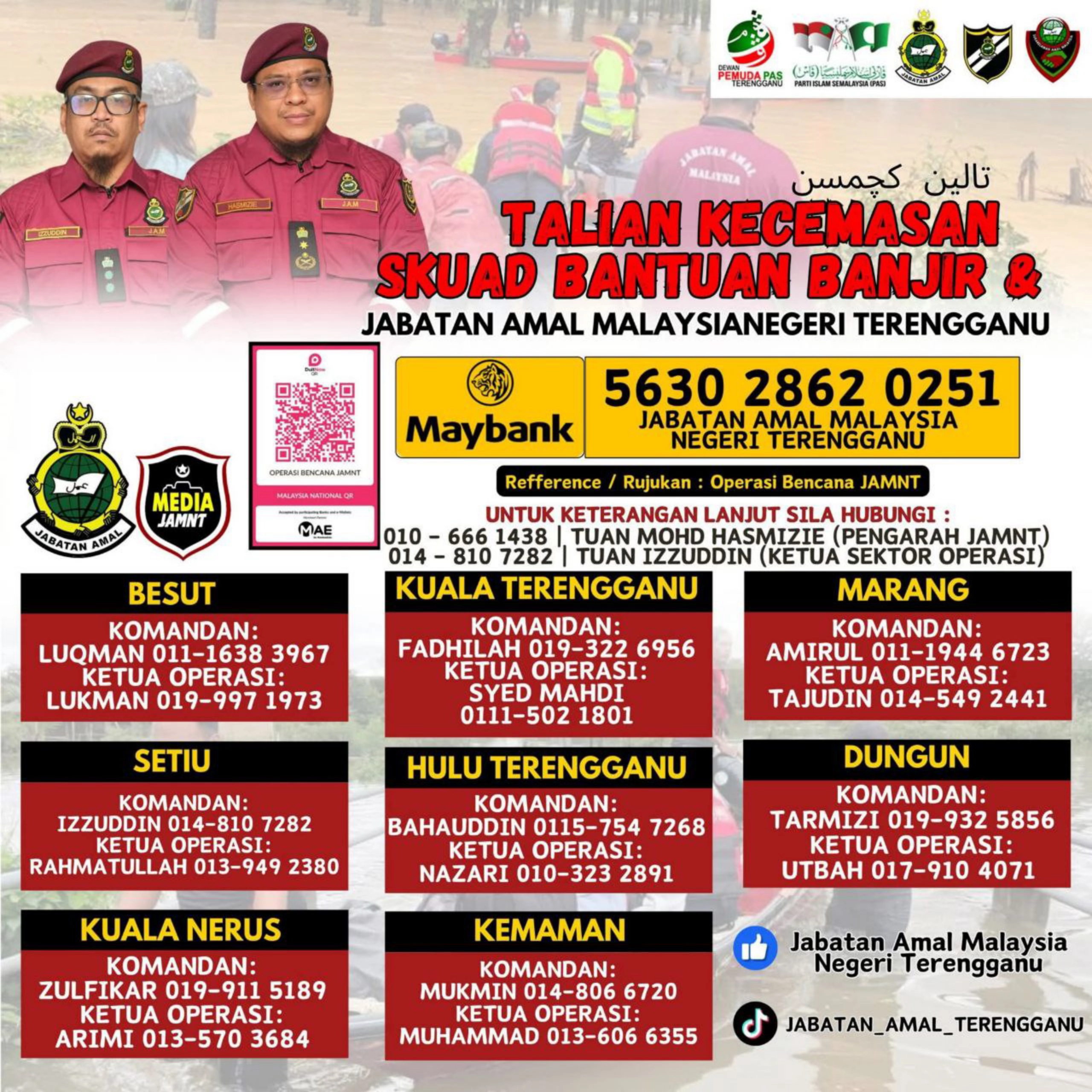 Dalam masa sama menurutnya, JAMNT membuka ruang kepada orang ramai yang ingin menghulurkan bantuan tenaga sukarelawan, peralatan atau sumbangan kewangan melalui akaun Maybank 5630 2862 0251 atas nama Jabatan Amal Malaysia Negeri Terengganu, dengan rujukan Ops Bencana JAMNT.