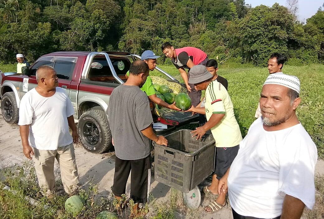 Haji Mansor ditemui ketika gotong royong menuai buah tembikai bagi dihantar ke pusat-pusat jualan dan pemborong.