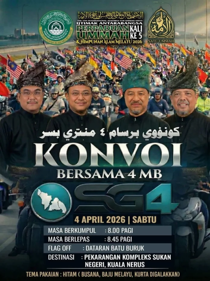 KUALA TERENGGANU – Konvoi Motosikal SG4 memperkasa peranan anak muda dan menyemarakkan perpaduan ummah apabila dijangka menghimpunkan penyertaan besar sempena Ijtimak Antarabangsa Perpaduan Ummah Kali Ke-5 dan Himpunan Alam Melayu 2026 hujung minggu ini.