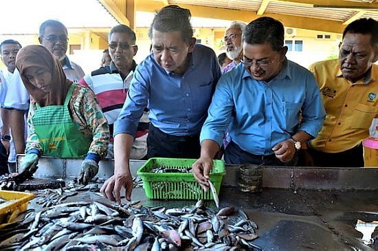 Agriculture and Agro-based Industry Minister Datuk Salahuddin Ayub (2nd from L) together with State Agriculture, Agro-Based and Rural Development committee chairman Dr Azman Ibrahim (2nd from R) peruse fresh fish that was landed and processed after a meeting with Terengganu fishing community leaders at Kuala Terengganu on Sept 2, 2018. — Bernama
