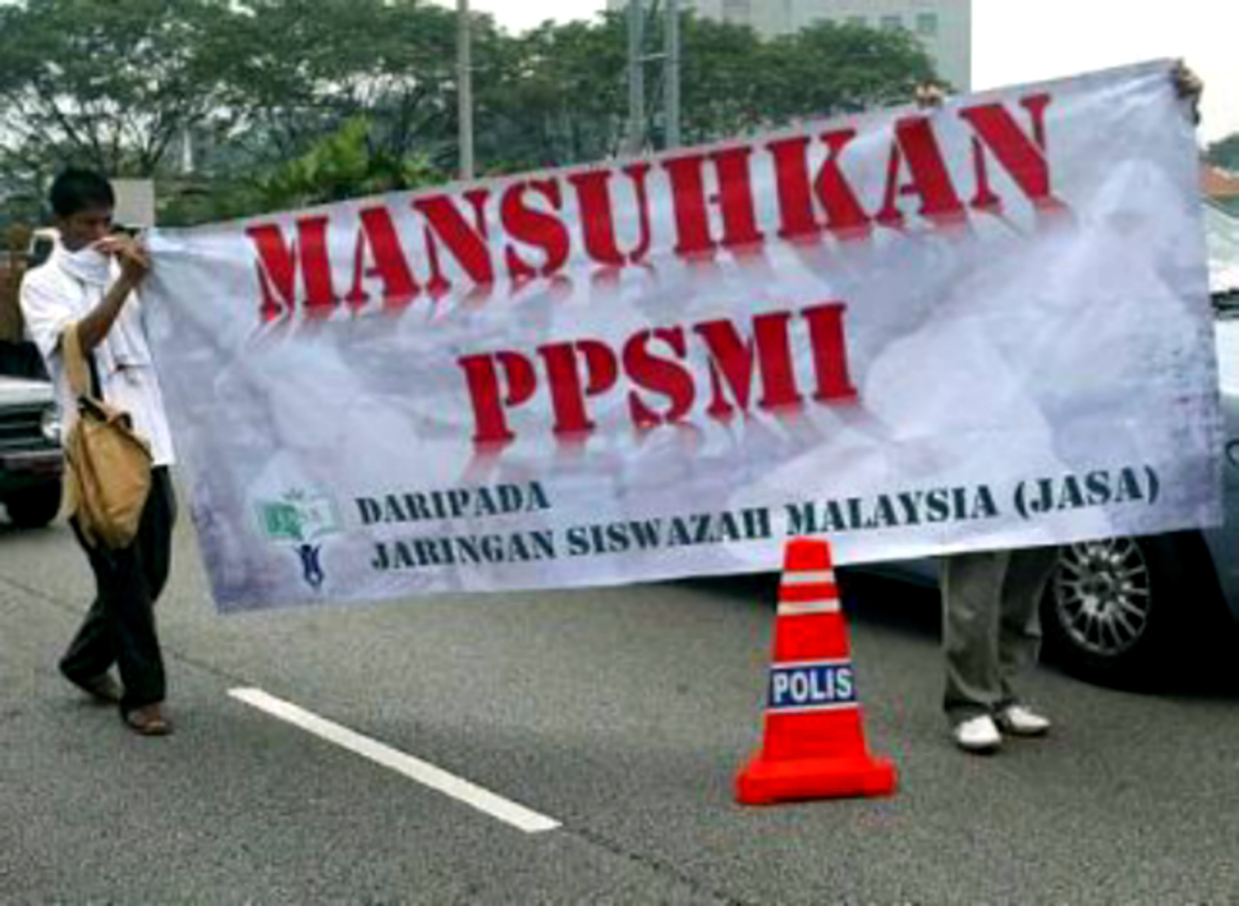 3. Dasar yang diluluskan melalui suatu mesyuarat khas jemaah menteri pada 2002 dan kemudian mula dilaksana pada 2003 itu telah mencetuskan demonstrasi besar-besaran pada Mac 2009 sebelum akhirnya diumumkan pemansuhannya oleh Menteri Pelajaran ketika itu, Tan Sri Muhyiddin Yassin.