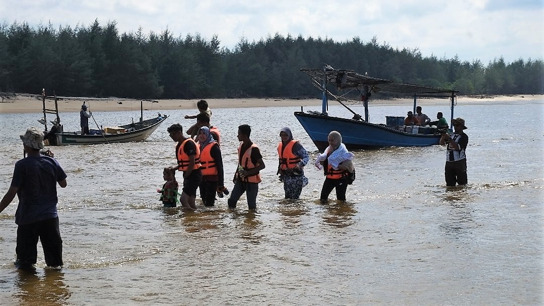 Bot nelayan yang tersadai dan pelanggan bot pelancong terpaksa turun,, kerana air cetek di muara Sungai Merang