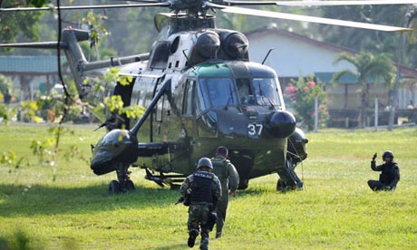 Pesawat mengebom kawasan di timur Sabah pada Selasa selama lebih daripada 30 minit sebelum beratus-ratus tentera darat berpindah untuk mencari kira-kira 180 orang ahli yang menggelarkan diri mereka sebagai ‘Tentera Diraja Sulu’ dipercayai bersembunyi berhampiran ladang pantai kelapa sawit, pegawai Malaysia katanya.