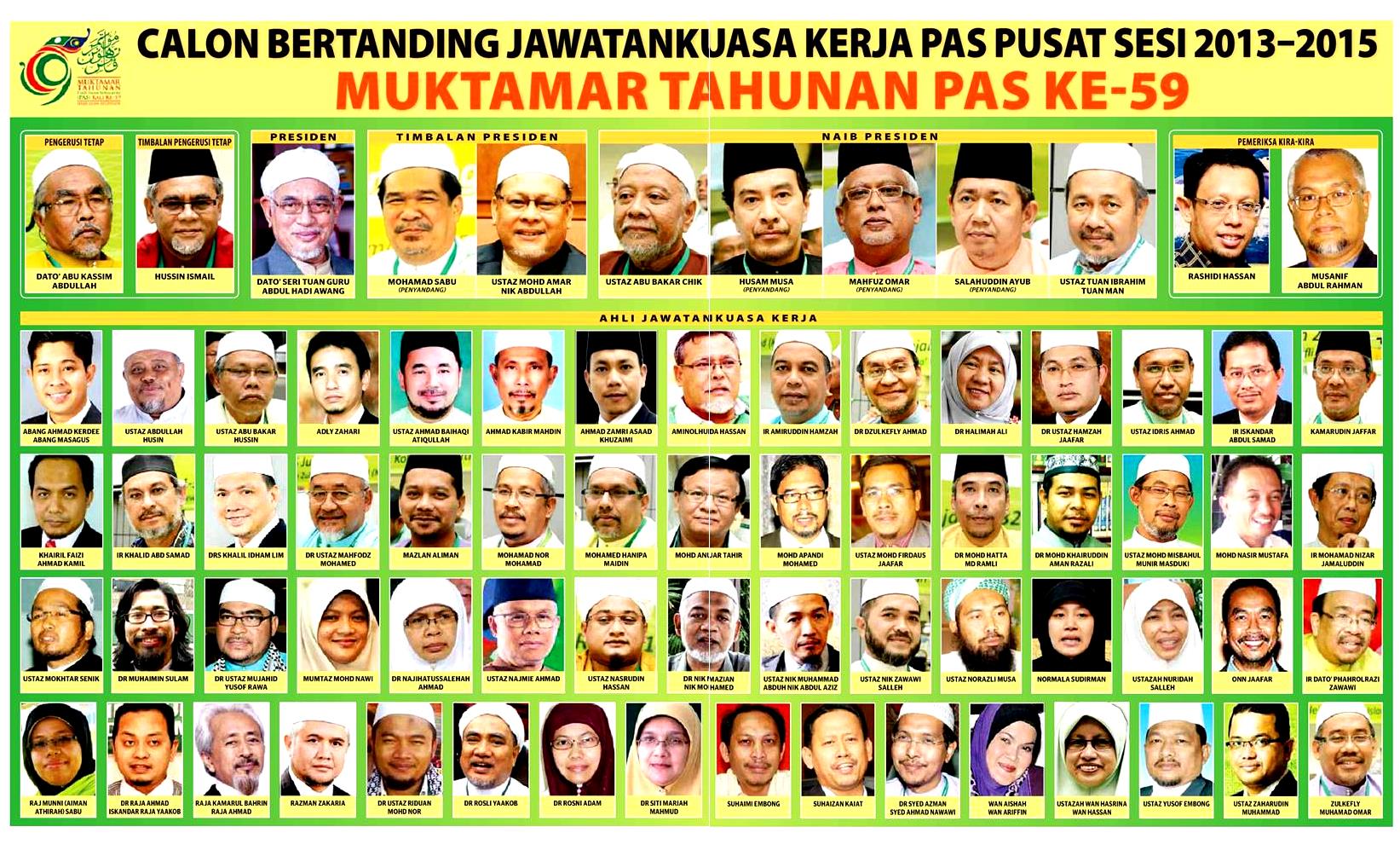 Lebih kurang 2 minggu dari sekarang, pada tarikh 22-24 November 2013 ini, Stadium Melawati Shah Alam akan menjadi tumpuan para perwakilan dan pemerhati dari seluruh negara. Muktamar Agong PAS yang akan menjangkau kali ke 59 bakal berlangsung dengan agenda utama yang menjadi fokus hangat di pihak kawan atau lawan adalah pemilihan kepimpinan baru PAS Pusat bagi sesi 2013/2015, samada di peringkat Dewan Ulama, Pemuda dan Muslimat serta Jawatankuasa PAS Pusat.