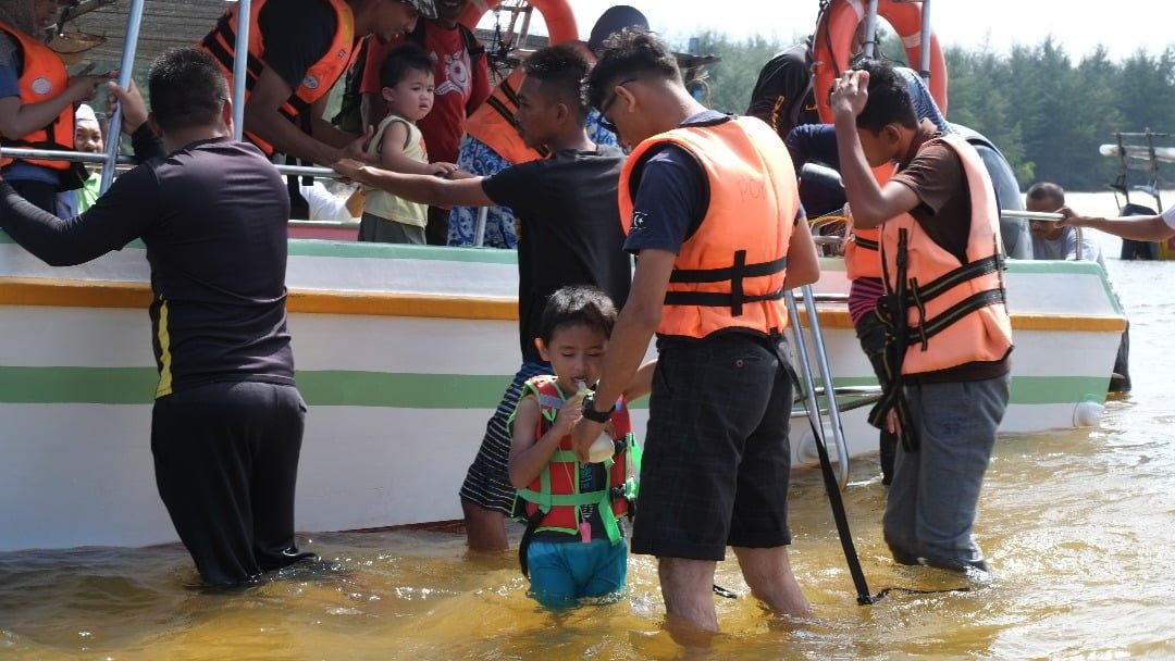 Membahayakan! penumpang termasuk kanak-kanak terpaksa turun daripada bot pelancong dan mengharung sungai kerana muara sungai Merang yang cetek
