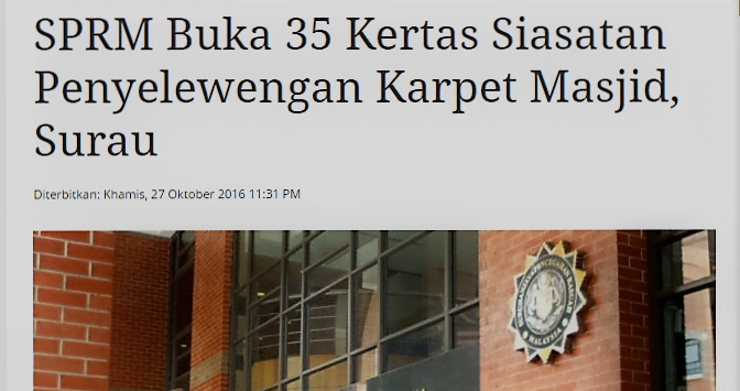 “Ada dua kes yang besar yang ingin PAS Terengganu berikan perhatian, iaitu kes penyelewengan pembekalan pemasangan karpet di beberapa masjid dan surau di negeri ini yang melibatkan tuntutan sebanyak lebih RM1 juta,