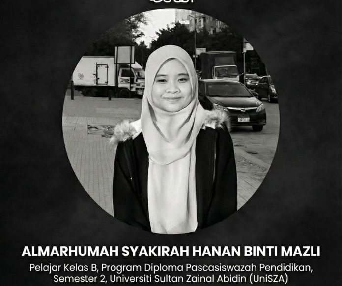 KUALA TERENGGANU – PAS Terengganu merakamkan ucapan takziah atas pemergian seorang pelajar Universiti Sultan Zainal Abidin (UniSZA), Allahyarhamah Syakirah Hanan binti Mazli, yang meninggal dunia akibat kemalangan di persimpangan lampu isyarat JPJ semalam.