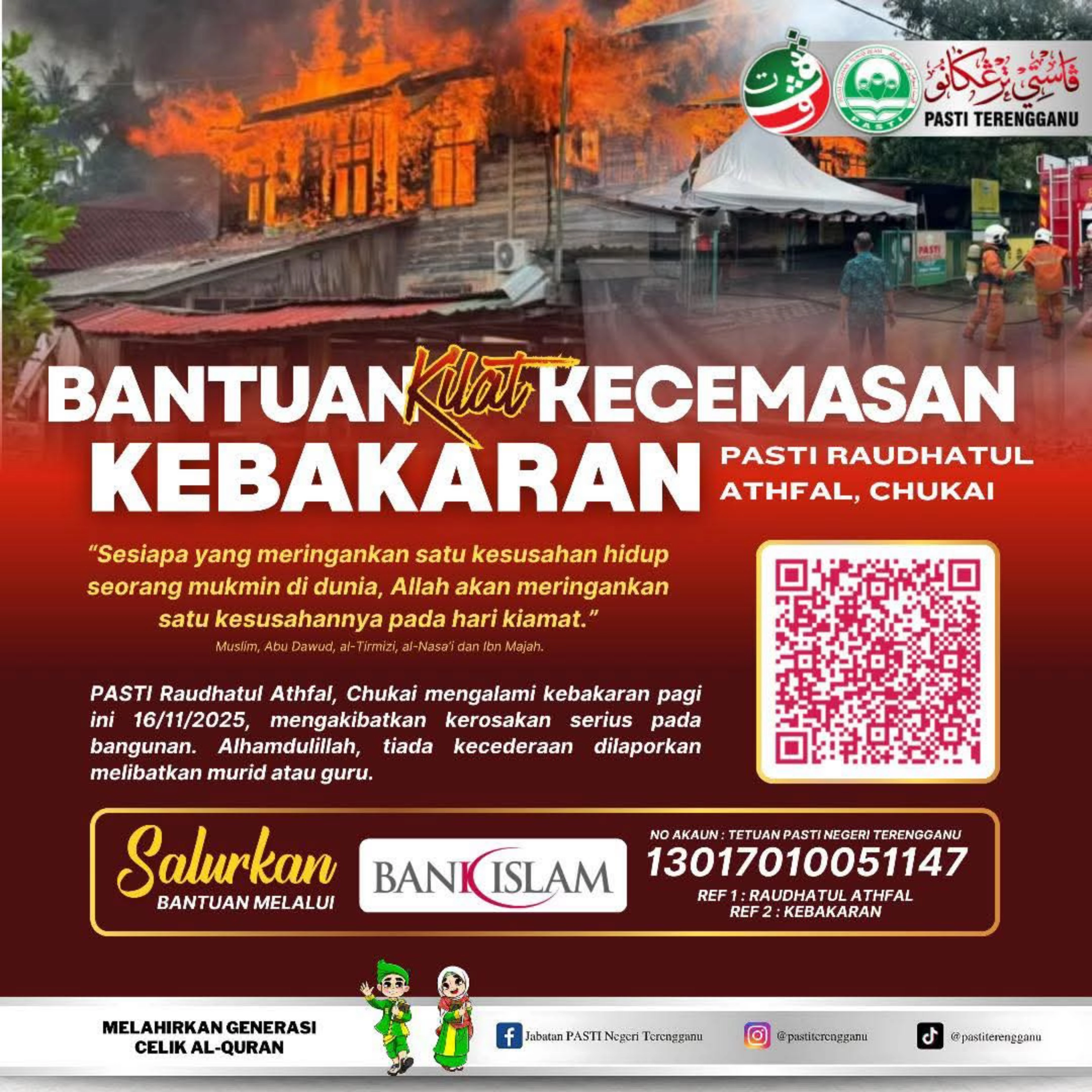 “Bank Islam: 13017010051147, nama akaun, Tetuan PASTI Negeri Terengganu, rujukan 1: Raudhatul Athfal dan rujukan 2: Kebakaran