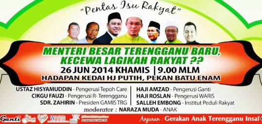 Dalam rangka meningkatkan gerakan menaikkan isu isu membabitkan kepentingan rakyat Terengganu, badan badan bukan kerajaan (NGO) akan menganjurkan satu program Pentas Isu Rakyat pada hari Khamis 26hb Jun 2014 bertempat di pekan Batu Enam, bermula tepat jam 9 malam.