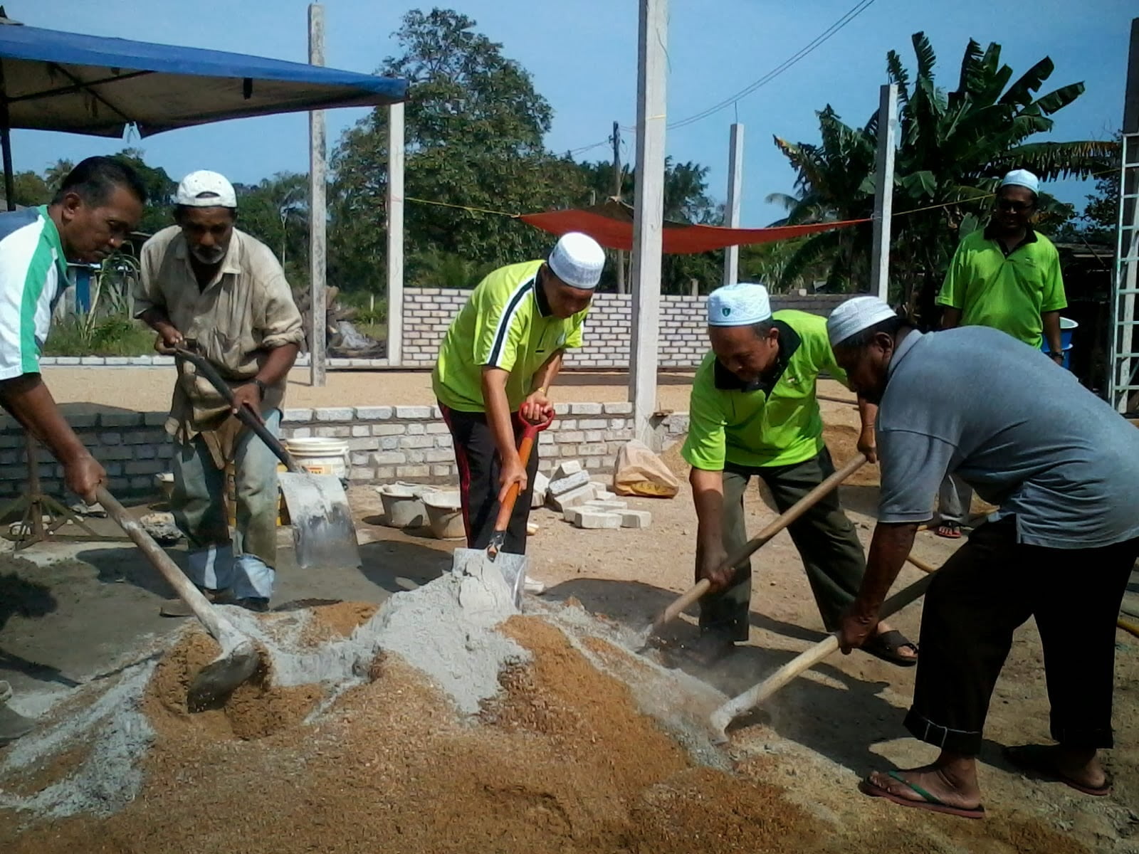 [Gambar atas – ADUN Sura Wan Hapandi (baju lengan belang) turut sama ‘menyingsing lengan’ menggaul simen, bergotong royong dalam program pelancaran Projek Rumah Moswa UPU Sungai Buaya]
