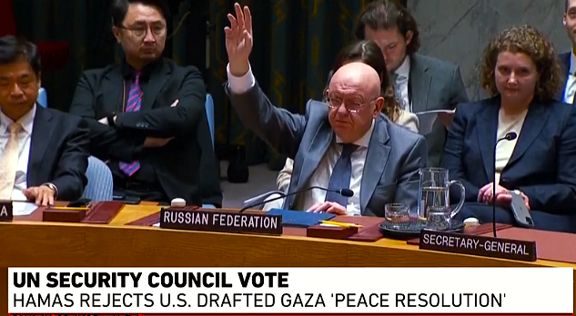 “Tiada kejelasan dalam draf mengenai garis masa untuk pemindahan kawalan ke atas Gaza kepada Pihak Berkuasa Palestin, mahupun kepastian berhubung Lembaga Keamanan dan Pasukan Penstabilan Antarabangsa, yang…akan dapat bertindak secara autonomi sepenuhnya, tanpa menghiraukan pendirian dan pendapat Ramallah,” katanya kepada Majlis Keselamatan selepas undian.
