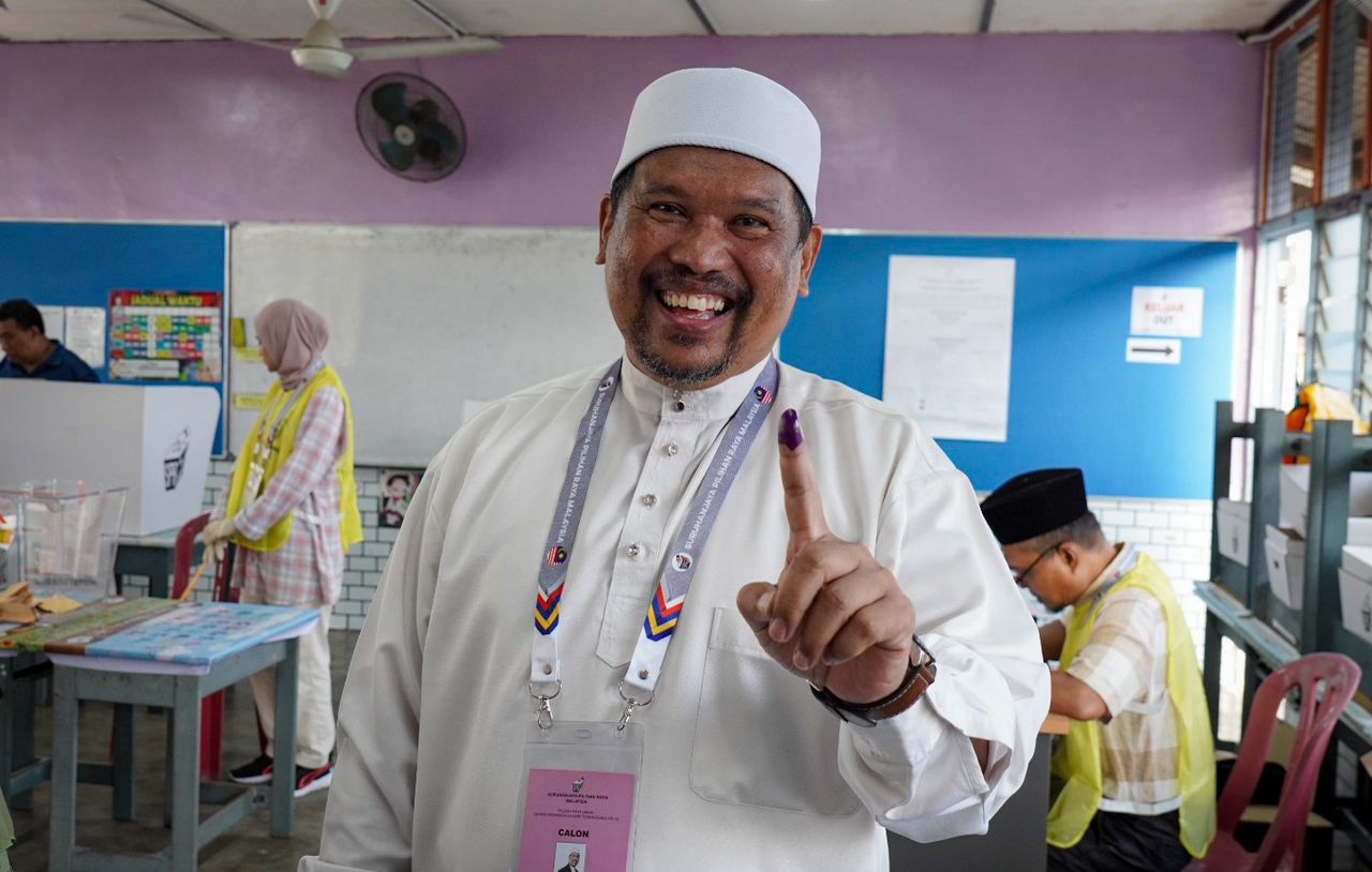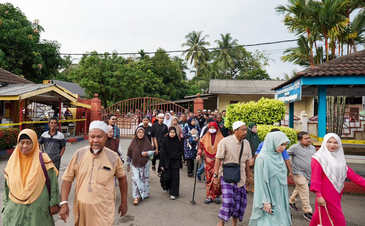 Turut hadir,calon PAS bagi Dewan Undangan Negeri (DUN) Paka, Saiful Bahari Mamat bersama isteri yang mengundi di pusat pengudian yang sama.