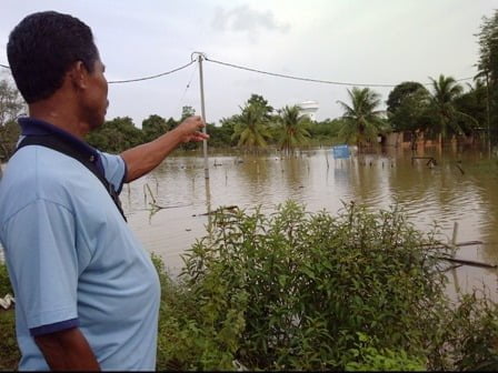 Memang kawasan kampung ini adalah adalah kawasan tanah rendah yang mudah dinaiki air setiap kali musim tengkujuh berlaku, tetapi banjir yang berlaku sejak 3 tahun kebelakangan ini adalah sangat di luar kebiasaan. Puncanya… Projek Taman Akuakultur Udang Bersepadu (i-SHARP) yang diusahakan oleh Syarikat Blue Archipelago Berhad. [Gambar kiri – Itu rumah saya….kata Pok Ya]