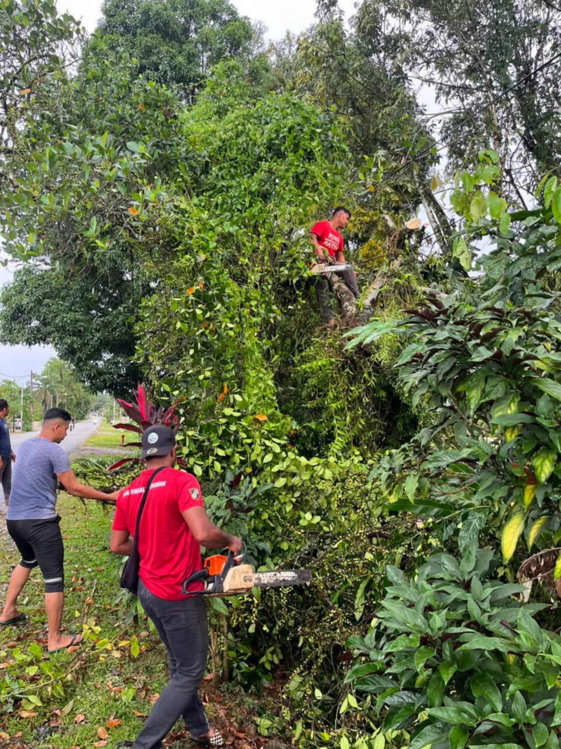 “saya menghubungi Jabatan Amal segera, Alhamdulillah anggota Amal datang sekitar jam 3.00 petang melakukan kerja-kerja mengerat batang pokok dan memotong ranting kayu.